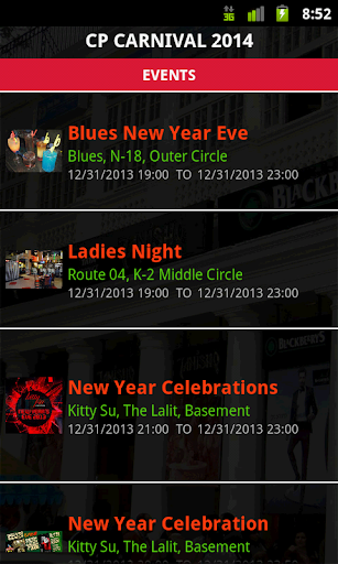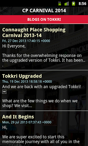 "CP Carnival 2014" is an application to provide comprehensive information about various activities happening during the two-week long shopping festival organized at Connaught Place, New Delhi, India stating from 23rd December, 2013 till 8th January, 2014. This app also features retail outlets in CP and lists down all the offers available in them. Users can get information about the events happening in CP and can browse through the pictures taken at the location as well.