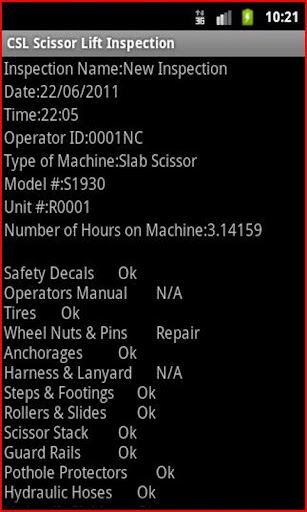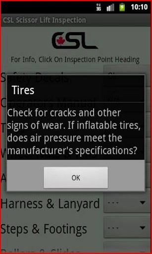 CSL Safety “Scissor Lift Inspection App” is designed to assists scissor-lift operators in completing their required daily inspections. This App allows users to view their past inspections and keep accurate records for future reference. A simple and easy to use layout helps make this daily task much less tedious. Submit function is included for saving to SD card and for easy file transfer.