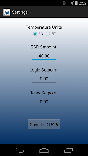 Wait for several seconds as the phone attempts to connect to the CT525. When a device is properly connected, “Scan” will change to “Disconnect” and temperatures will appear. To change units and setpoints, select the Settings button and change the appropriate settings. The CT525 is updated when the Save button is selected. Then use the back key to return to the previous screen.