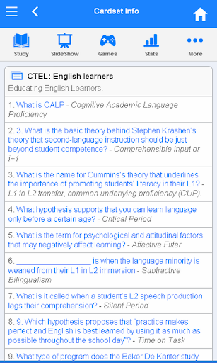 Using Flashcard will help you learn faster and remember more in a shorter time by showing flashcards just before you will forget them. CTEL Flashcards app has several learning modes: Study, Slide show, Matching, Memorize, Quiz to make the learning process for CTEL exam more exciting and fun.