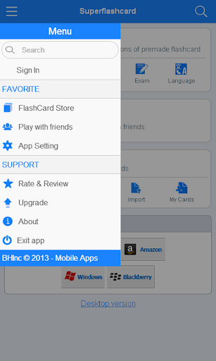 This app is also available on Apple App Store, Amazon Kindle App Store, Blackberry App Store and Windows Phone App Store. Please visit us at http://about.superflashcard.com/tour/ for more information .