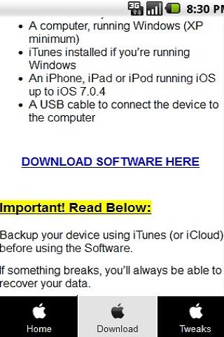 In this App you'll find all necessary Informations and Downloads to Unlock and Jailbreak your iPhone and install Cydia!