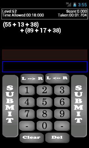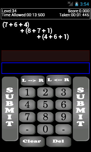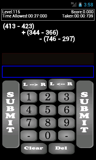 Randomly generated addition / subtraction ( and the occasional multiplication ) equations that get harder on each level. Currently a maximum of 126 levels, ranging from single digit equations to three digit equations consisting of up to 3 operands in up to three sets of parenthesis !!!