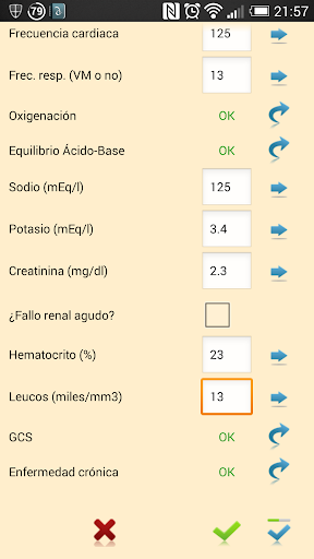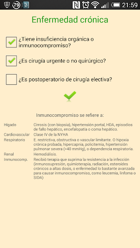- Pantalla de detalles con el desglose de puntos por apartado y resultados de los cálculos que se hicieron, para que puedas comprobar los resultados con facilidad y contrastarlos con las tablas originales APACHE.