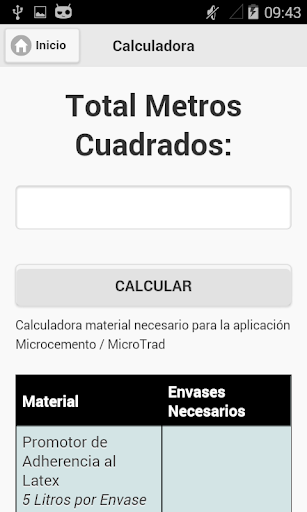Calcule al instante los materiales necesarios para la aplicación de Microcemento Tradicional según metros cuadrados.