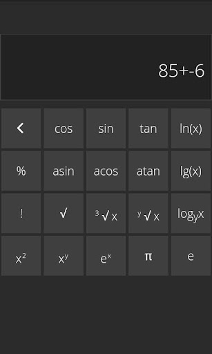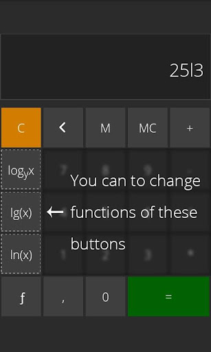 Calculatius is just a handy calculator with some uncommon features. You can change functions of some buttons. For this you have to hold your finger on that one which has a border. After approximately a second of the holding, you get a window where you will choose a needed math function.