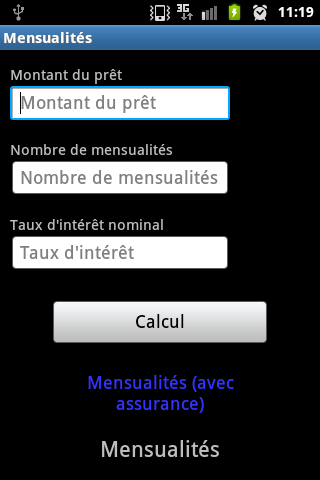 Avec votre application "Calculs d'emprunts", vous pourrez déterminer bien plus que la simple mensualité à rembourser chaque mois. Vous pourrez calculer le coût de votre crédit, la durée de ce crédit ainsi que le coût de l'assurance pour une ou deux personnes.