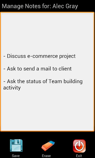 - Select a contact and add notes to it. When that contact calls you or you call to that contact, a popup with the notes you added will be displayed on the screen.