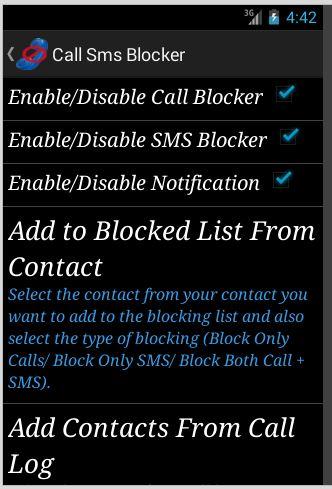 This is a Call blocker & Message (SMS) blocker application. You can block calls and sms for each and every contacts. Using this application block unwanted calls. Now no need to ask your service provider not to send you unwanted messages. Just block the number from where they are sending sms and calling you.