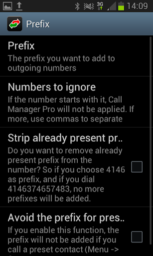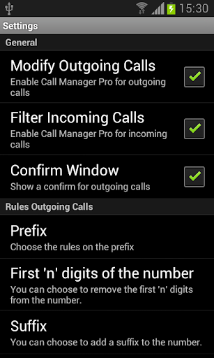Call Manager Pro is an easy to use tool that automatically manages incoming and outgoing calls. It can add prefixes and suffixes based on contacts, times and days, it can also hang up incoming calls with the option of sending an sms when you are busy and many other features. Fully customizable!