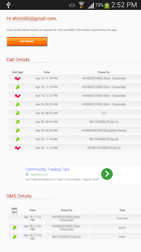 - You can see your mobile tracks by visiting our website http://callsmstracker.com/cst and entering your Email ID and PIN. You need to click on "Get Details" button to pull details from your mobile. Call and SMS details will not be pushed to server automatically.