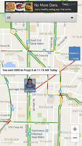 - Click on “View” buttons in the app and you will see the tracks of the last Call or SMS (locations visited) on Google Map view and list view.