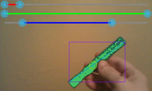 This test app demonstrates motion tracking using RGB range detection on a uniquely-colored object. It works best with a green highlighter, but any solid bright color will work if the sliders are configured accordingly.