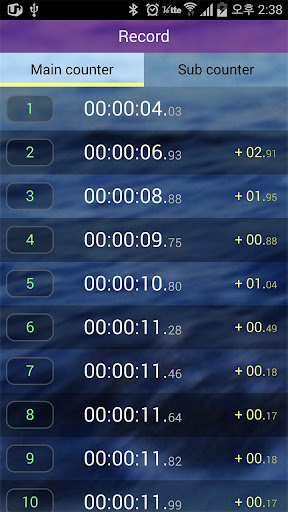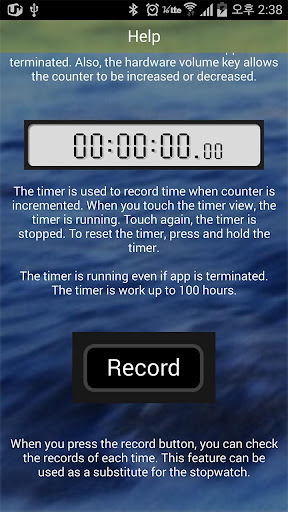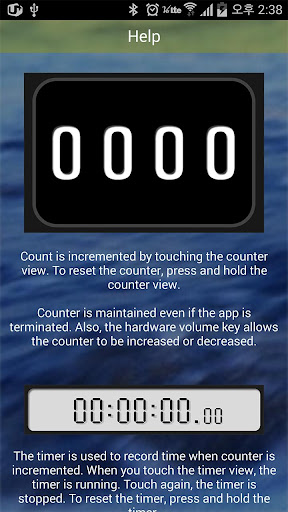 The timer is used to record time when counter is incremented. When you touch the timer view, the timer is running. Touch again, the timer is stopped. To reset the timer, press and hold the timer.