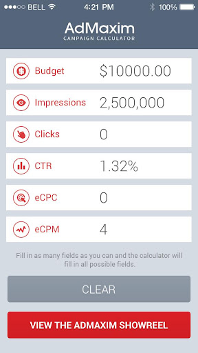 The AdMaxim Campaign Calculator makes all those tricky digital campaign planning calculations simple. You never need to push your mental arithmetic to the limit again, as the calculator allows you to fill in the information you know (such as campaign Budget, Impressions, Clicks, CTR, eCPC, eCPM) and receive all the possible metrics available from that information.