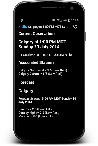 This app shows the Air Quality Health Index for Canada displayed on a map. Click on the marker to see more description. Clicking the InfoWindow will show you the full AQHI observation and forecast from Environment Canada.