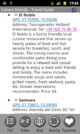 MobileReference Travel Guides provide detailed, practical information about attractions, landmarks, transportation, cultural venues, dining, lodging, history and much more. They are indexed alphabetically and by category, making it easier to access individual articles. Attractions can be viewed on an offline GPS map along with your current location so that you can easily find attractions near you as you explore the city.