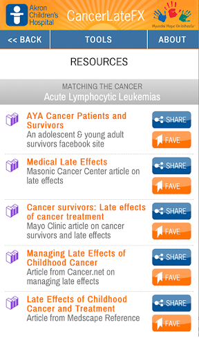 The CancerLateFX app offers childhood cancer survivors the resources, tips, and tools necessary to help minimize potential problems, or late effects, caused by childhood cancer and/or its treatments. CancerLateFX was created by Akron Children's Hospital, through a generous grant from Hyundai Hope on Wheels. The CancerLateFX app is free and can be used by any cancer survivor and their providers.