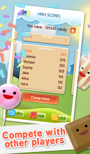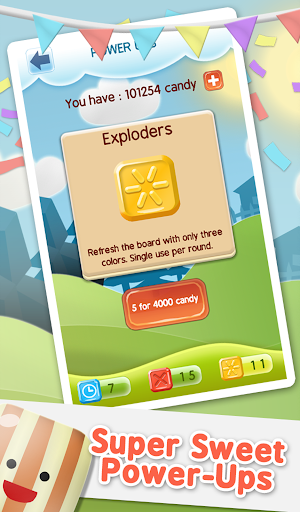 Collect deliciously sweet candy as fast as you can. Tap group of candies with matching color to collect them. Tap on a group of six or more matching candies to wipe the board of that color and collect double the candies. But watch out, avoid tapping an ungrouped candy or it will burn out.