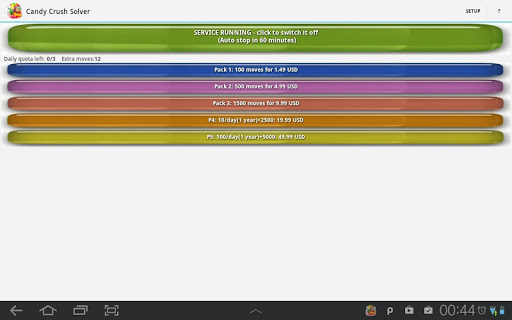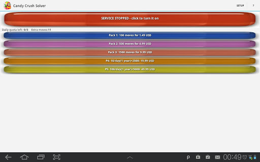 You can have 3 free advices per day. If you need help to use the service, send us an e-mail at candy.crush.solver@gmail.com or try our Google+ circle (https://plus.google.com/u/0/communities/112596176066891451607). It’s also worth reading the FAQ that comes with the App.