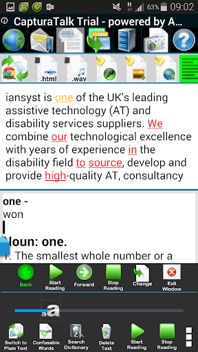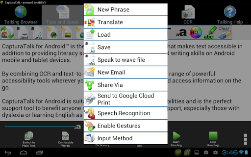 CapturaTalk is a powerful reading comprehension tool that enables users to access and understand any text (online, digital, material) at any time. It uses a variety of tools to achieve this, such the accessibility focused web browser and word processor, and a suite of pedagogic resources. CapturaTalk is useful for anyone who needs help with reading, especially those who have dyslexia or who are learning English as a second-language.