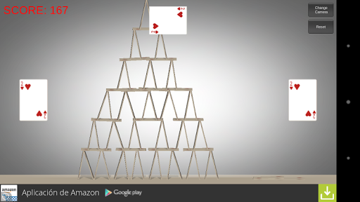Para realizar castillos deberás coger cartas de los laterales para hacer los pilares y de arriba para poner las bases. ¿Cuantos niveles serás capaz de hacer? Con el botón de reset podrás limpiar la zona y volver a empezar mientras que con el de change camera podrás elegir la vista que mejor se adapte a tu forma de jugar. Disfruta viendo como se cae todo una vez que hayas construido un gran castillo.