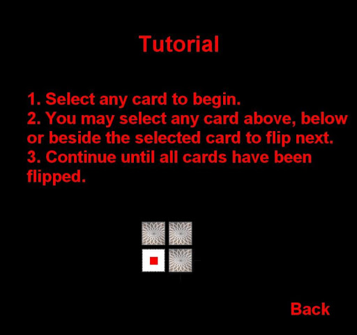 You start by selecting any card. Next, flip any card above, below or beside the selected card. Keep doing this until all cards in puzzle are flipped.