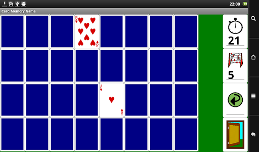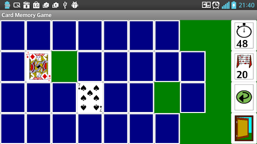 Card Memory Game is a card game in which cards are laid face down on a table and two cards are flipped face up on each turn. The object of the game is to turn over pairs of matching cards. The game is also known as Memory or Pairs. In our version of the game player can use decks of 20 or 32 playing cards. Cards are laid face down in four rows of five or eight cards each. In each turn player chooses two cards and turns them face up. If they are of the same rank and color (ace of hearts and ace of diamonds, king of clubs and king of spades, …) player wins the pair and cards are removed from the table. The game ends when the last pair is picked up. Time is recorded and added to leaderboard.