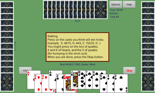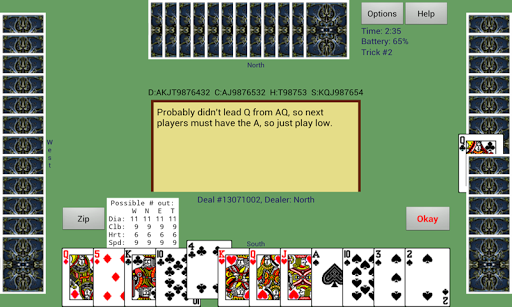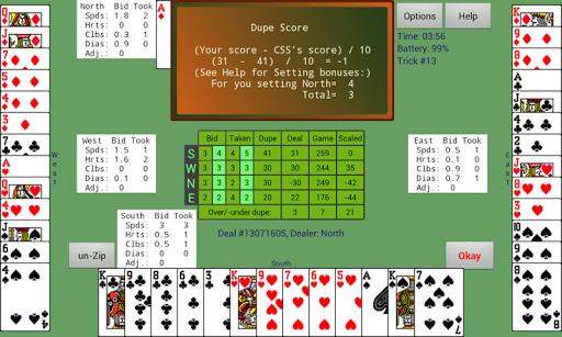A Duplicate mode allows you to compete against the CardShark playing your cards after you complete each deal. View the bidding and play a card at a time for maximum learning, or Zip through the CardShark's turn in a second to quickly get the Dupe score. In the non-Duplicate mode, if you want to know how the CardShark would have played your cards, you can hit Replay and AutoPlay and the CardShark will play your hand for you.