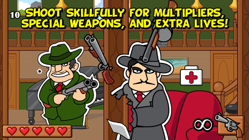 Tap the screen to shoot those silk-hatted hoodlums. Hit the target center on to bump off the villain immediately. Pick up special firearms from some thugs by hitting their weapon. Cardboard Crooks love their hats. Shooting it off will make them come after you harder.