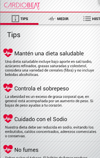 Mide tu pulso con CardioBeat. Mantén un histórico de tus mediciones y envíalas por correo a quien quieras. Descarga tips para ayudar a mantener tu corazón y salud en forma.