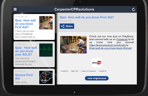 Application includes a news feed with up to date topics on CPR, First Aid, and Advanced Cardiovascular Life Support for Healthcare. Also includes links to social media, quizzes and a course calendar to aid in registration at WWW.CarpenterCPRsolutions.com
