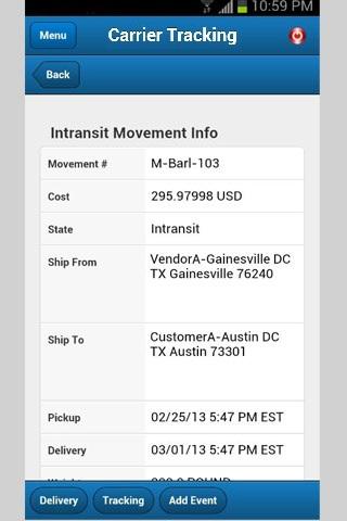Carrier Tracking Service (CTS) provides mobile Carrier users the ability to monitor all movements managed in One Network in Tendered, Confirmed, Intransit, and Delivered states. CTS delivers the track and trace functionality to Carrier users in a powerful, easy-to-navigate app. With CTS, a Carrier user can