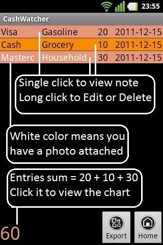 If you are busy to make an entry right after purchase, this application gives you an option to add a photo of your purchase or receipt (by double clicking on it's photo image) as a reminder to add the corresponding entry later.