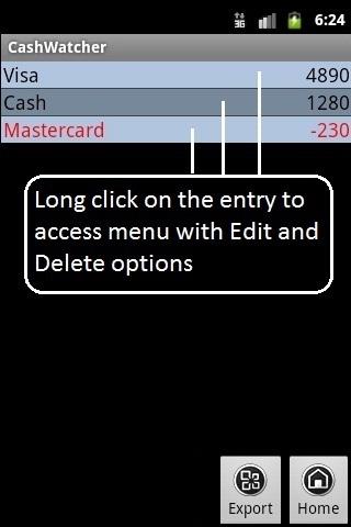 A long click on any entry leads to menu with "Edit" and "Delete" options for the clicked entry (except for entries on the main screen - click on them to see their menu options).