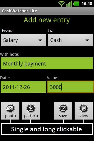 "Photo", "Pattern", "Save" and "View" buttons on the "Add new entry" screen support long clicks too. Long click on the: