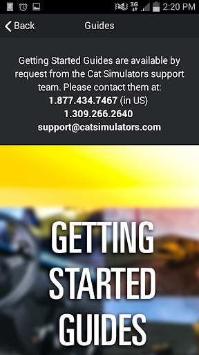 The Cat® Simulators support mobile application provides access to technical support content. Users can download and view guides, FAQs, and access details for contacting various Cat Simulators departments.