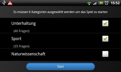 Wird ein "schnelles Spiel" gestartet, müssen keinerlei Kategorien ausgewählt werden, es werden zufällig 6 Kategorien gewählt.