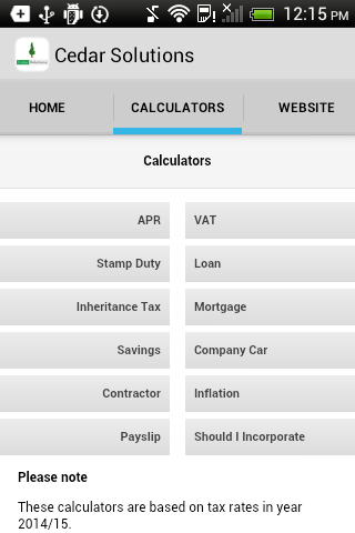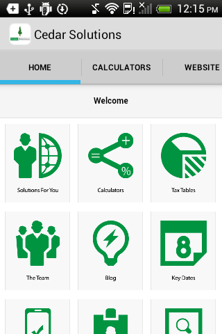 Now you can have instant access to your latest business and personal accountancy facts, dates and calculators. Using the latest technology, the ‘News’ section will be updated directly by us, so you get the very latest news, views and offers from Cedar Solutions accountants - in real time, all through your App.