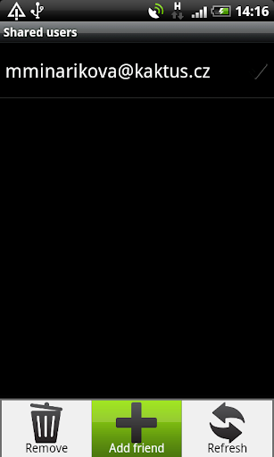 For location sharing there is an accounts list, where you must add the PoM ID of the person who wants to watch you (the other person must have a PhoneOnMap account). In this list you can see PoM IDs of all people who can see your position.