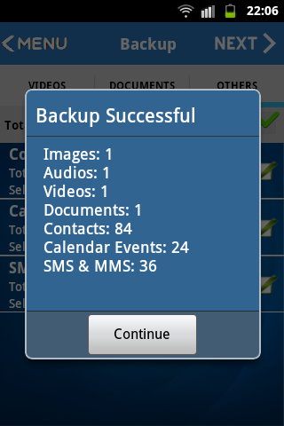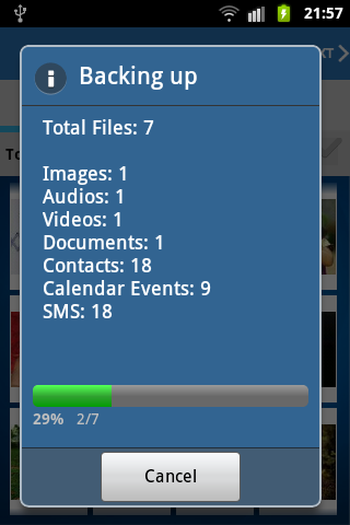 Cellulike Advanced application backs up and restores contacts, photos, videos, documents, music, sms/mms & calendar, all from the phone memory and/or SD card.