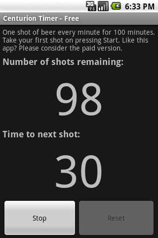 Paid version plays an alert sound (of your choice) for each drink, offers a choice of game modes (including Half-Centurion, Power Hour and Spartan), and allows the screen to be locked on for the duration of the game. Please consider upgrading if you enjoy this app.