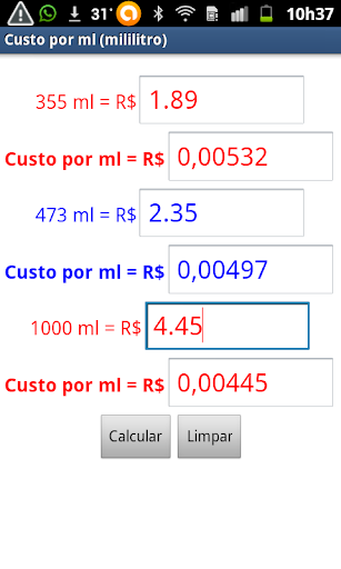 2 - Pressione o botão Calcular para obter o custo por ml (mililitro).