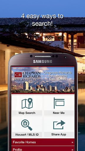 The free Chapman Richards and Associates Android app is customized and optimized for our local market here in Salt Lake City, Utah and surrounding cities. Find real estate listing details, share your favorite homes on Facebook and Pinterest, email homes to your family and friends, tag homes as your favorite, add and remember saved home searches, unlock any home for a tour, and view photo slideshows. With a tap, see pictures and detailed information on all homes for sale in vivid high resolution clarity.