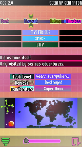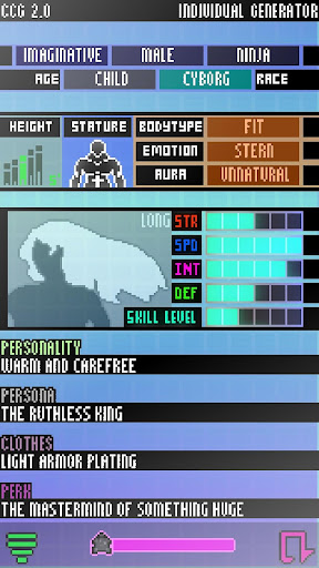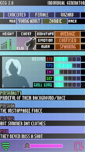 The CCG 2.0 generates a random set of descriptions, ranging from persona, emotions, strengths, professions. Everything you would need to imagine a unique character. There is also an RPG style meter, showing things like STR, SPD, INT, and things like that which are bound to help you understand your random character more.