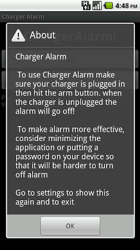 Don't worry about having to leave your phone charging unattended! Charger alarm will sound an alarm when your phone is unplugged. Useful for when a plug isn't near somewhere to sit so that you can leave your phone and know it will be safe.
