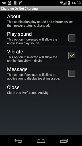 This application play a sound and vibrate device then power status is changed. Works with all kind of power, usb, Ac and wireless (Qi).