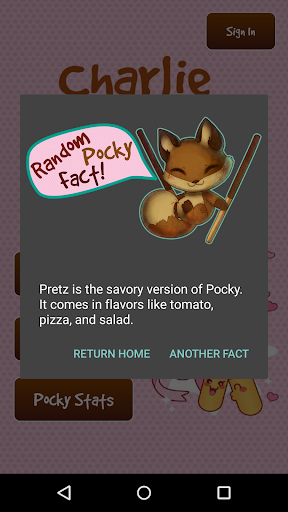 Charlie and the Pockylate Factory is comprised of three main components: Hungry Charlie, a mini-game where the player helps Charlie get to the Pockylate Factory as fast as possible; Pocky Facts, where the player can learn all about the magical, mystical world of Pocky; and Pocky Stats, where players can perform quirky conversions based on Pocky sticks and boxes of Pocky.