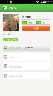 【主要功能】——能够交换 WeChatID、KakaoID、WhatsAppID 和 FacebookID。——能够搜索性别、年龄和注册聊天账户。——能够通过“您好”按钮表达您的感觉——能够轻松复制和粘贴。——能够上报恶意用户,保护自己。