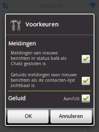 - Notificatie van berichten in de systeem status balk, zowel met als zonder geluid. Dit kan aan/uitgezet worden.